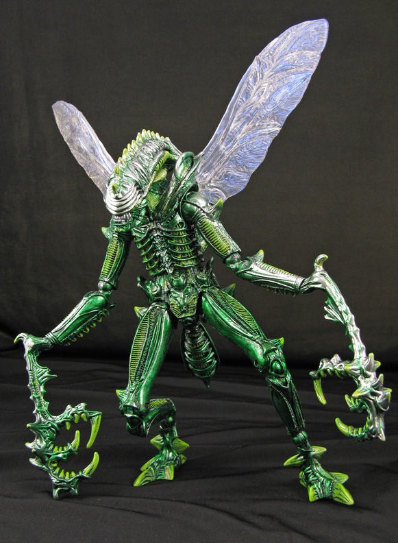 Hisssssss! That's the last thing you hear before this custom Mantis Alien gets his pray on! Based off the vintage Kenner figure this creepy insectoid features Aves Studio's Apoxie Sculpted details like the head and spikes. The arms and feet came from the Kenner figure and were grafted on to the NECA Xenomorph warrior. He was then given a two-toned airbrushed silver over top of metallic green. Some Joyride Halo Drone wings were given ball joints and are removable from the back in case this custom Mantis Alien needs to take to the skies.