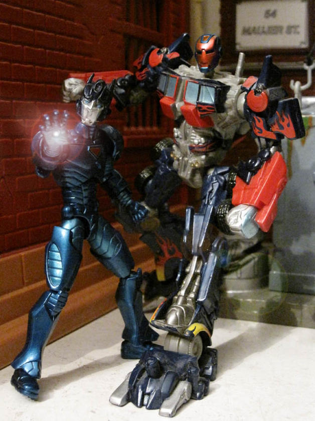 Just messing around. Made a quick Iron Optimus. And I thought it would be cool for Iron Man to have Decepticon-Buster armor. Just simple head swaps. I used the robot replicas Optimus Prime from the first movie.