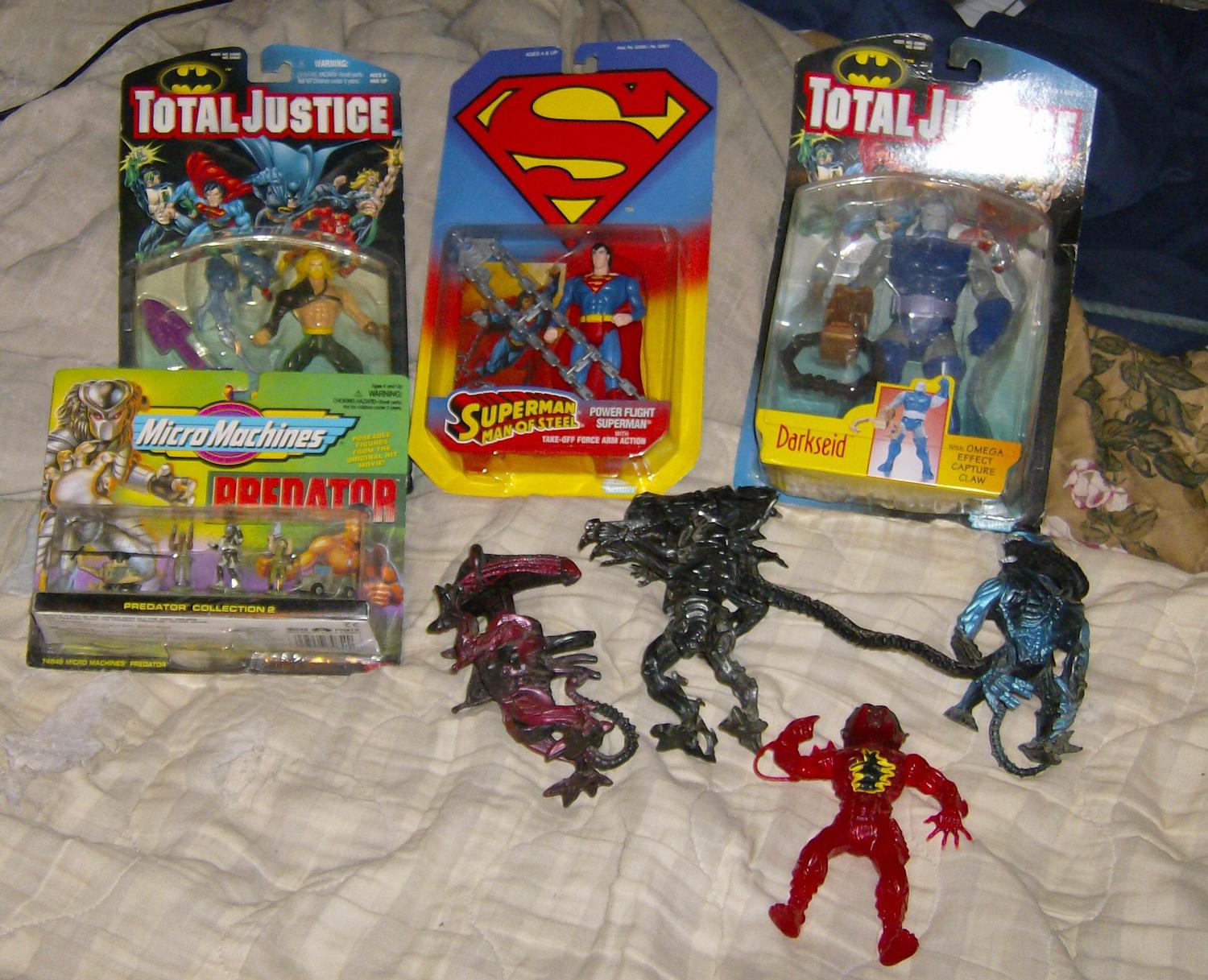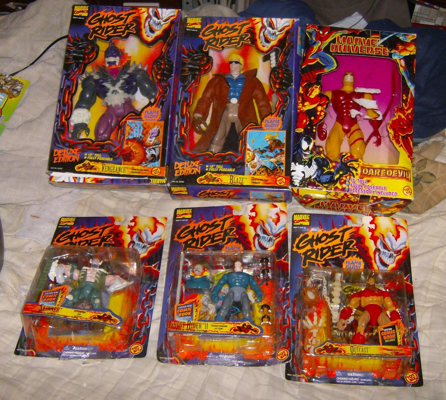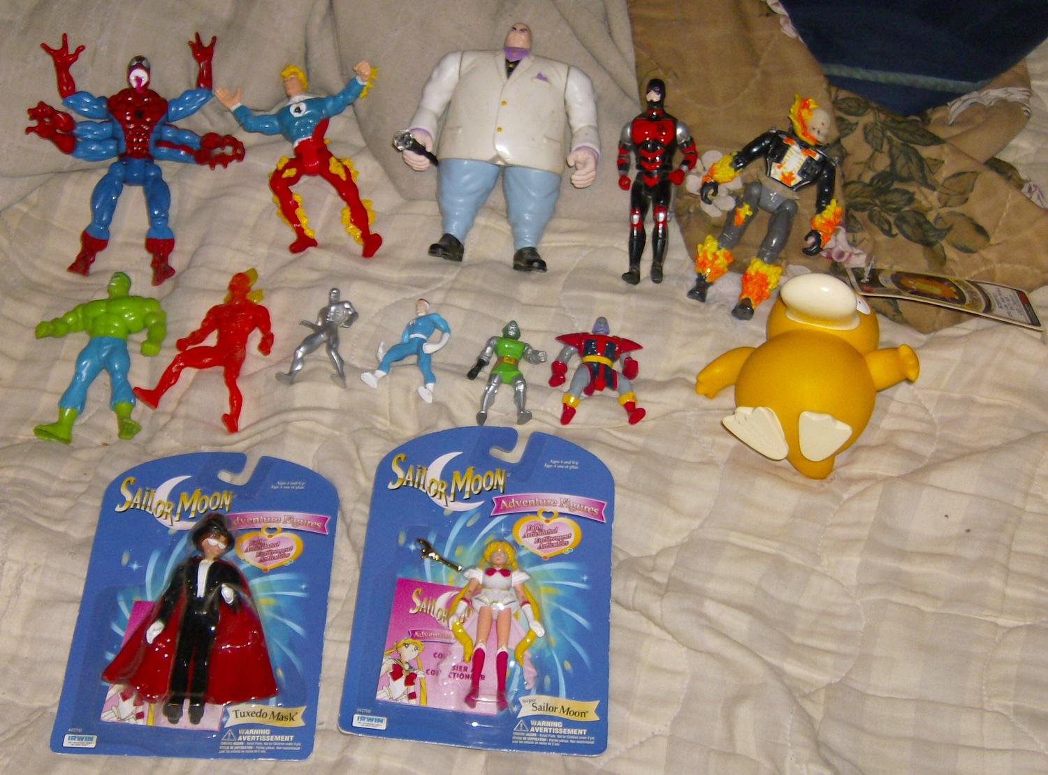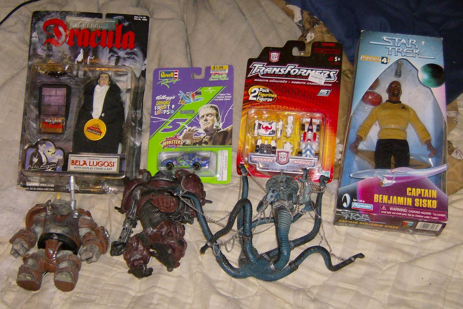$3 Total Justice Aquaman $4 Darkseid $3 Micro Machines Predator Collection 2 $4 Alien and Predator figures $3 each 5"Kingpin,Johnny Storm,Doppleganger $3 each 5" Daredevil(missing weapon)Ghost Rider(missing chest piece) $3 each Happy Meal(?)Hulk and Human Torch(not pictured) $2 each small half diecast Doctor Doom(missing cape?),Reed Richards,Silver Surfer and Terrax $2 each 10" Daredevil $4 10" John Blaze and Vengeance $5 each 5"Ghost Rider figures;Skinner,Outcast,Ghost Rider II $4 each Hercules Legendary Journeys Xena $2 Tomy vinyl Pokemon Psyduck $3 Transformers RID Ironhide&Mirage $5 McFarlane snake woman $3 McFarlane Total Chaos Hoof and Ape $3 each 10" Star Trek Deep Space 9 Captain Sisko in box $3.75 Revell Racing Terry Labonte Universal Monsters diecast on card $3 Premiere Exclusive Bela Lugosi as Dracula on card $3 |