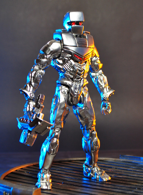 Here's a figure that's been requested again and again in 6" scale, it's Rom the Space Knight! I've created this mighty robotic warrior this week to battle your cosmic villains in all his shiny glory using a movie Cyborg, beetle arms, hand sculpted Apoxie sculpt head/chest/details, and a custom space blaster. I used Rustoleum gloss black lacquer as a basecoat and airbrushed Spaz-Stix mirror chrome over every inch while the lacquer was tacky to the touch. A light gloss coat of liquitex sealed the chrome and Rom was ready to battle cosmic baddies!