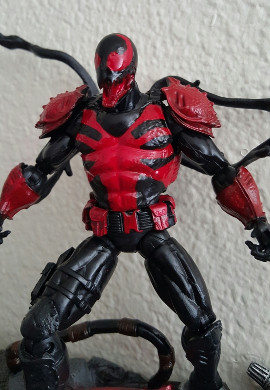 Fresh off of his recent appearance in Carnage #4, Eddie Brock is back as Toxin...only this time, it's Agent Toxin! Agent Toxin was put together using an Agent Venom body (of course...) only the collared body armor pieces, as well as the belt were cut and removed. The head is the alternate head released with the recent Marvel Legends Venom. I also used a Spider-Carnage head to use as an alternate, more classic Toxin look (although I prefer the Venom head myself...) Tamiya acrylics were used here, along with a Krylon Gloss to seal them and to give our newest symbiote agent a nice sheen.