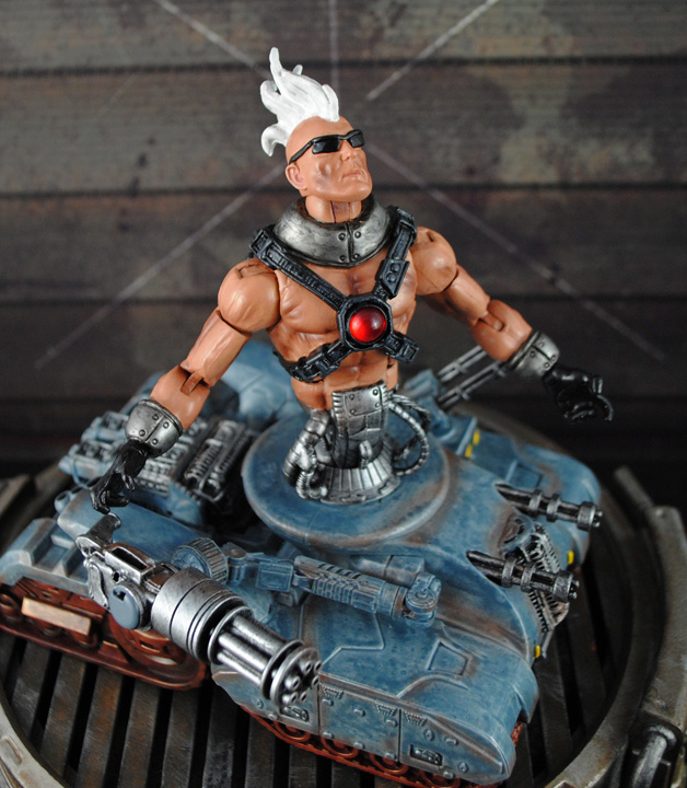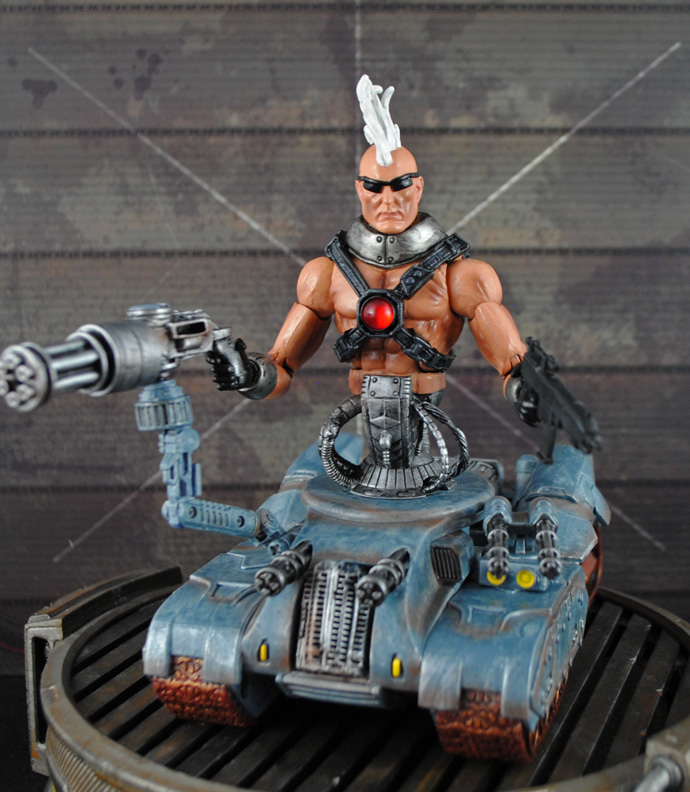 He's half man, half tank, but all attitude! Here's the evil mutant, well cyborg, Bonebreaker! You may remember him from the vintage toybiz Xmen line and here he is in Marvel Legends form. I went with a modern look for him instead of the 80's look here giving him all sorts of weaponry. Bonebreaker's upper body is comprised of a basic medium ML body, movie juggernaut head, Fantomex hands, and TMNT baxter stockman robot-head body along with some hoses. His lower tank is a combination of a Terminator tank, MARS treads, Transformers, Halo, GI Joe, Spawn, and probably every other toy line fodder part that looked the part. Bonebreaker can aim his Gatling gun cannon around and the twin-barreld one on the other side moves as well. Roll him and his upper body swivels back and forth to aim at his enemies!