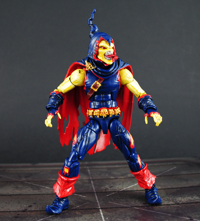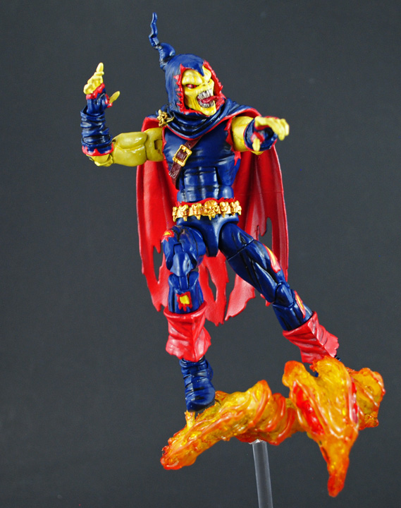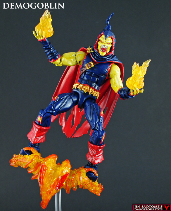 Straight out of Spiderman's Maximum Carnage series comes the devilish Demogoblin and here you get him in Marvel legends scale! This custom Demogoblin was created by taking a Space venom series Hobgoblin, cracking open the body and replacing it with Machine Man limbs, the original Hobgoblin lower limbs, Jack o lantern hands, and sculpted costume tears. Belts were added and his hood tip changed as well. The goblin glider was completely covered in high temp sculpted hot glue and turned into his flaming firebird glider which Demo can ride into battle!
