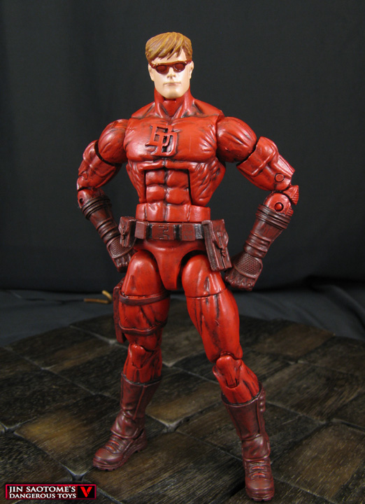 Leaping across the rooftops of Hell's Kitchen is a man who proves justice is truly blind, it's Daredevil and he's swinging your way in a brand new style! Here I created this custom Marvel Legends Daredevil using a basic medium body, movie Electro arms and legs, Movie Masters Batman hands and the awesome looking Face Off Daredevil head. His chest symbol was sculpted on, a belt and pouches were added, and he was painted using a variety of different shades of red and black. One bendable wire billyclub later and Daredevil was ready to fight crime anywhere, anytime!