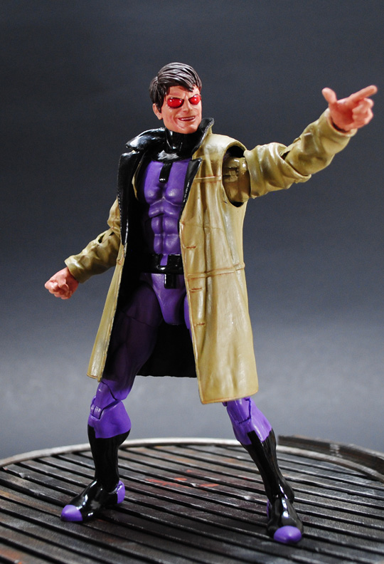 Fear his robot head fleshy ones, it's Machine Man! Straight from the Nextwave comics series I bring you this custom Aaron Stack created in Marvel Legends form. He was created using the man-thing wave Bullseye's body/hands, Punisher coat and arms, resculpted evil Warlock head, and Aves Studios apoxie sculpt detailing. His weapon pods can be attached to his wrists and are created from lots of fodder tech-weapon parts from various lines. You can also equip Machine Man with his trademark extendo-wrists. The entire figure was airbrushed with shadows, highlights, and sealed with Liquitex archival varnish.