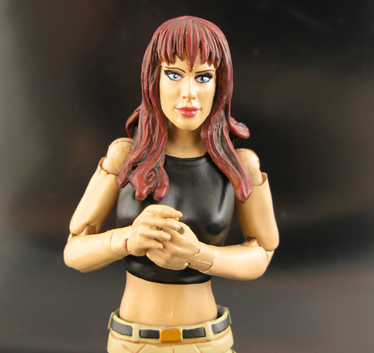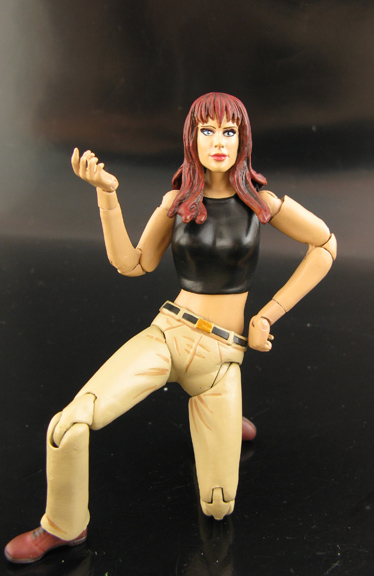 Here's Spiderman's gal Mary Jane Watson made into a 6" Marvel Legends figure based on her classic comic appearances. She's made from the body of a Shocker Toys Katchoo, arms from a deluxe Buffy figure, and resculpted Elektra head. She wields a purse and cellphone so she can call Peter and tell him to swing by the store for milk after beating up the Lizard.