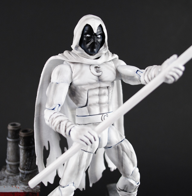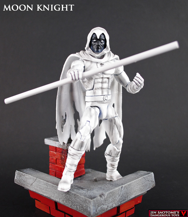 In the light of the full moon this hero is at his strongest, it's the legendary Moon Knight! Ready to take on any challenge Moon Knight was created using an Eel/Blizzard body base, Hobgoblin modded hood and cape, Punisher hands, sculpted details and real fabric wrappings for his arms and legs. A bright white/gray/black monochrome paint job completed Moon Knight's look as well as a bo-staff for weaponry.