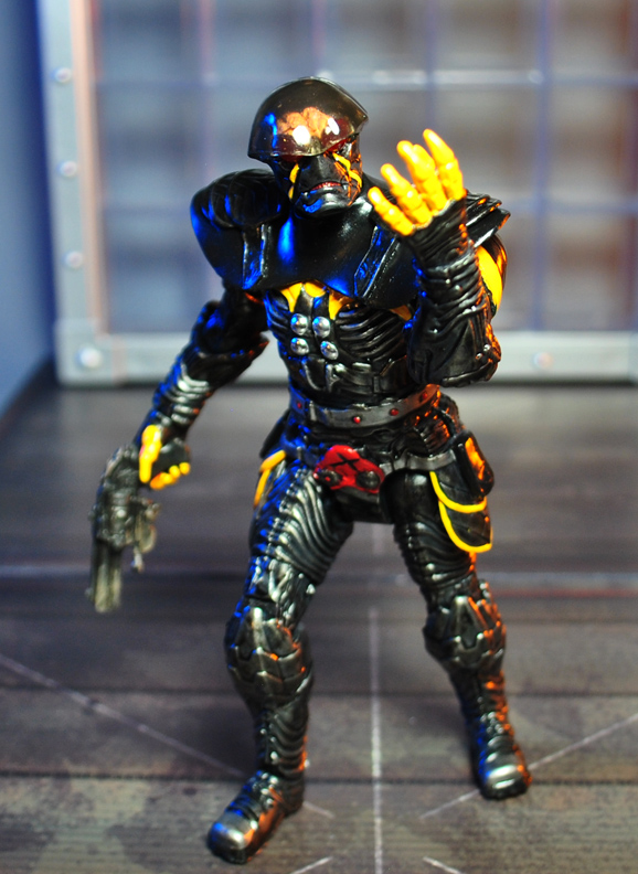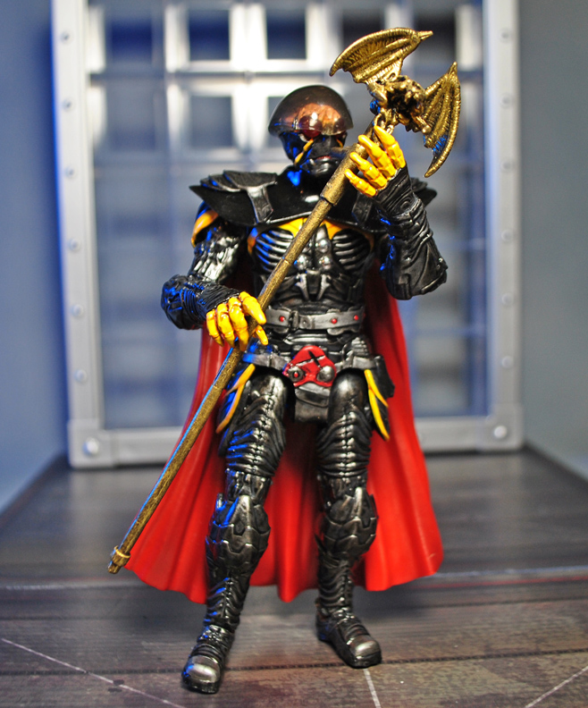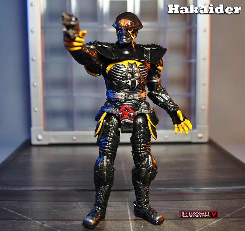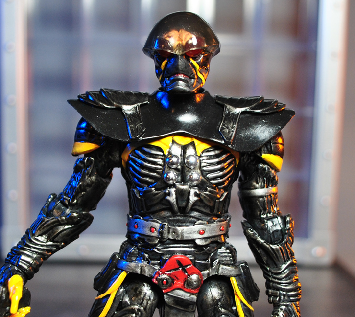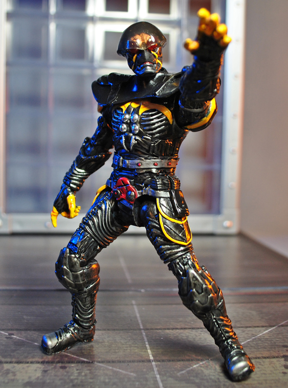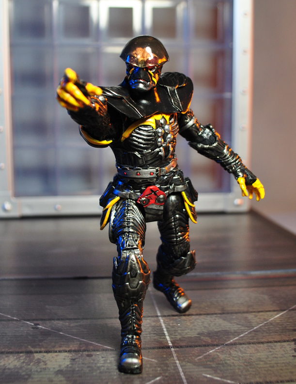 An android without memory, wandering the world, is he friend or foe? This week I bring you Hakaider from the Kikaider anime done in Marvel Legends 6" form. He was created using a Multiverse Parademon body, SIC Hakaider statue head, animated Batman cowl, Hawkman armor, Big Red Predator belt, and Zod shoulder pads. I gave Hakaider a sleek black-gunmetal bodywash with classic anime yellow/red colors to complement him. Hakaider features a magnetic removable cape, pistol, and Professor Gill's flute.
