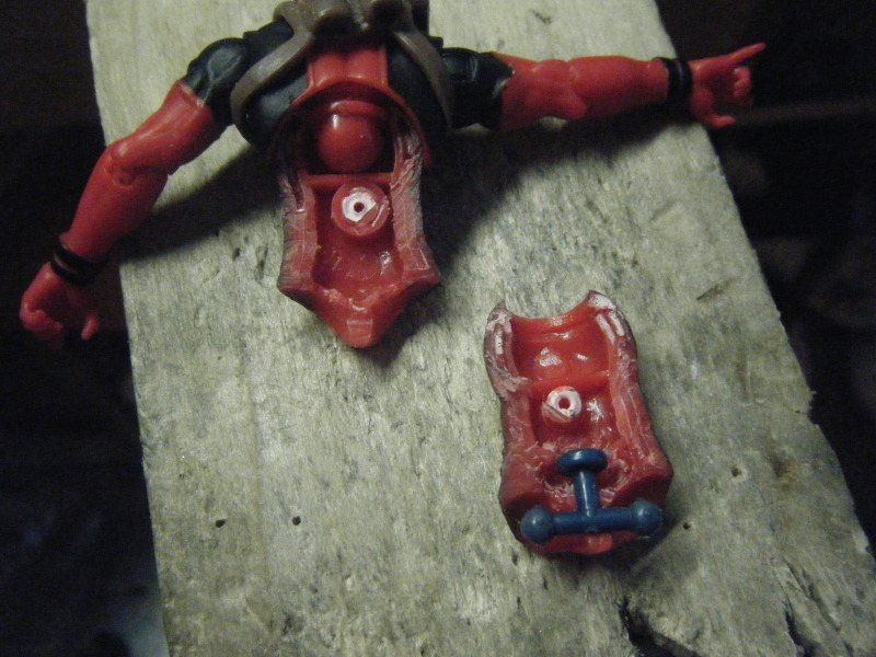First I picked the blaster pack Deadpool, because his red matched Scarlet Spider's much closer than the single carded version. I boil and popped the legs off at the thigh swivel, then cut out the pin and pulled off the hip balls (snicker). ![]() ![]() Then I used snips to cut out the hip discs and tried to drill them down out of the way. Next I measured a Marvel Universe T bar I had previously scraped from a multiple man. I used my digital calipers to find the thickness of the post so I knew which drill bit to pick. ![]() I also measured the distance up from the bottom of the crotch before drilling my new hole (snicker snicker). ![]() Now I took my saw frame and carefully cut up the seem. ![]() I turned the torso 90* so I could cut as far up the seem as possible ![]() Then I took a flat screw driver I sanded to be extra wedge/flat/sharp. ![]() I carefully snapped the lower torso apart. ![]() Now I could carve a bit on the inside to make room for the top of the T bar. ![]() Glued the torso back together. My screw driver left a tiny seem gap, so I used green stuff to fill it in. Luckily Deadpool has black there, so I won't have to worry as much about paint matching. ![]() I could be done now, just paint the pouches on the scarlet spider's ankles... ![]() But instead I boil and popped the knees off and added Deadpool's original lower legs. This got him closer in height to his counterpart. ![]()
