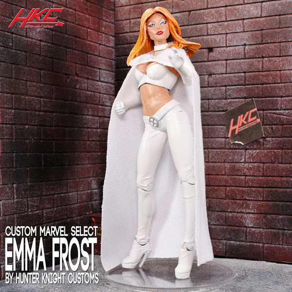 I recently got this Marvel Select Emma Frost which was in dire need of some TLC, so I went and fully repainted her, sculpted a belt, X insignia, and replaced her face with a MOTUC one with resculpted nose. I also gave her a fabric cape so Emma can move.