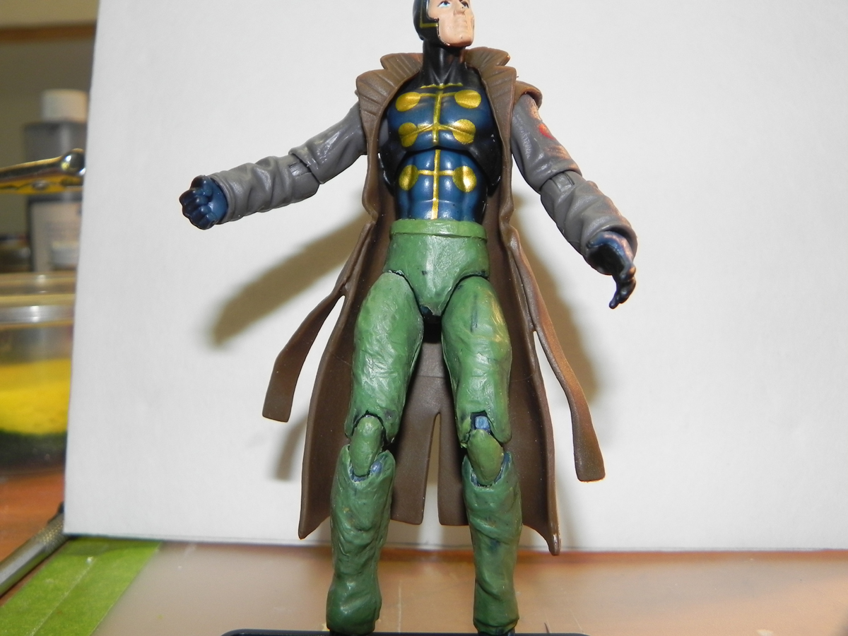 My buddy Ashrok wanted multiple man to have his signature jeans and trench coat. I started out by hunting for a good jacket and ended up using a DC Universe Hush figure. I originally thought that the arms for the Hush figure could be used for this custom, I was wrong! I ended up using the arms from ROC Destro and they look pretty good on him. I still need 3 pairs of them though, oh well. Anyways after I started to piece this guy together Ashrok asked me if I could do jeans for him so I started looking at Joes and was going to use ROC Cobra commander but because the multiple man figure has the body of a high school anorexic chick they just didnt look right so I decided to see how sculpting jeans over the existing legs would look. There is still alot of shaping sanding and cleaning up to do but I wanted to know every ones thoughts so far. As allways, comments and criticism welcomed. ![]() ![]() ![]() ![]() ![]()