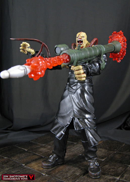 Here's a custom Resident Evil Nemesis action figure that's sure to get your blood spilling! It took me a while but I was able to track down the open mouth Palisades variant to use. His head, wrists, and ankles were all given ball joints (neck has a double) so he can be posed in better positions. To look like the Marvel Vs Capcom 3 version his Rocket launcher was made from parts and even has a rocket blast effect you can add on. Nemesis has removable arm tendrils added to mimic his tentacle slam attack from the game. A longer grappling tentacle can be attached to his right hand to ensnare foes and Nemesis was given a complete paint job in MvC3 Nemesis colors. Now this beast is ready to find and exterminate the STARS team once and for all!