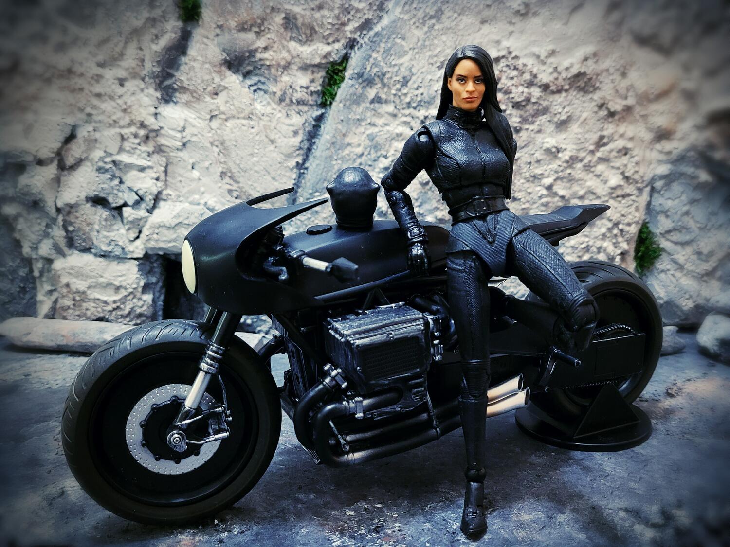 Until a third party company can give us a decent Zoe Kravitz head, the role of Catwoman will be played by a modded WWE Battle Pack (Basic) Zelina Vega. You have to do a bit of dremeling, but the hair lays perfectly over the shoulder once you hollow it out a bit. It looks a little small...but when compared to the masked head, I feel it scales pretty decent.