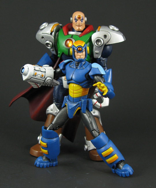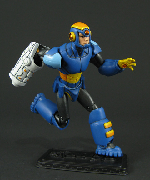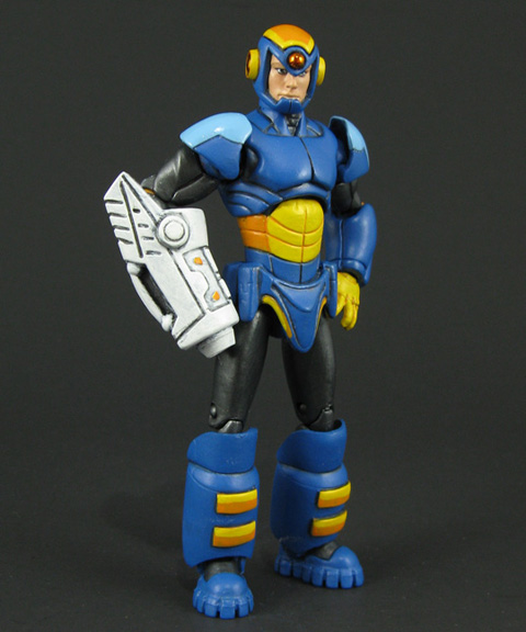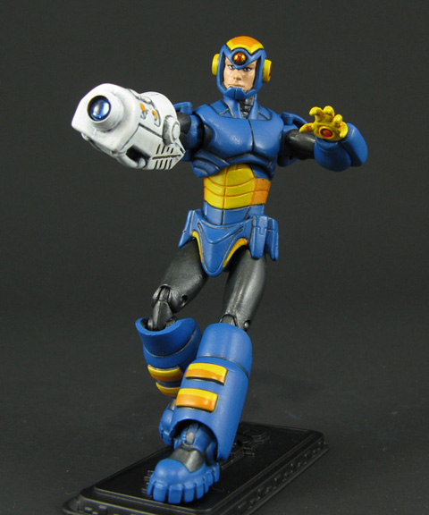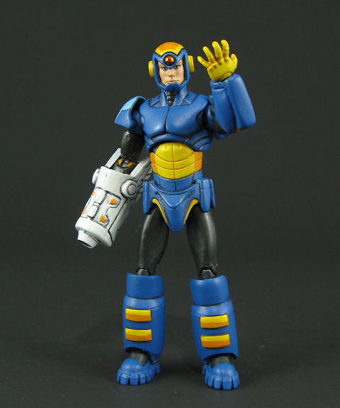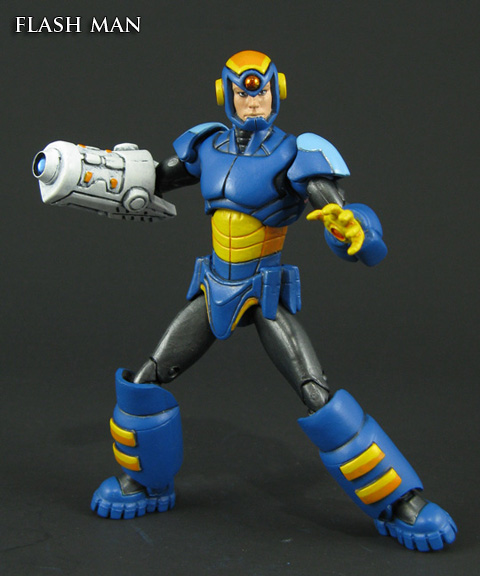Another Megaman Alterverse character, Flash Man is here to ruin the Joe's day! This blinding Robot Master was created from a Marvel Universe Extremis body, Duke head, Miss Marvel legs, Avengers Skrull belt, Revoltech lower legs and Titanium Man feet. Fodder parts were used for his arm blaster and Aves Apoxie Sculpt was used for his custom helmet and chestplate design. |