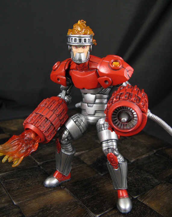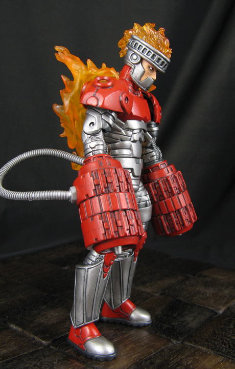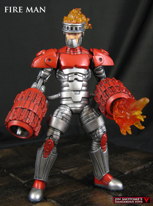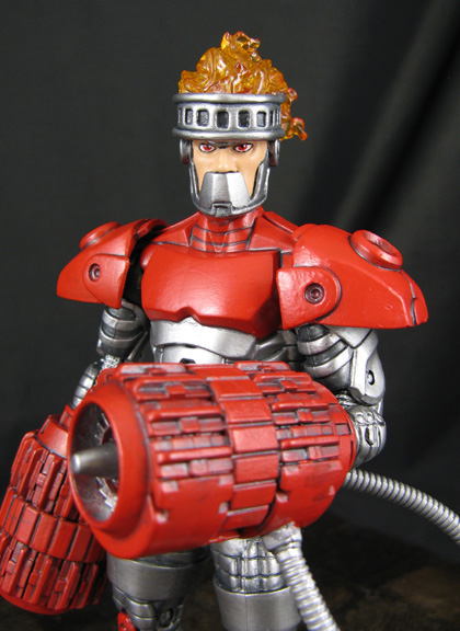 My Megaman Marvel Legends line returns with the appearance of a toasty nemesis, the Robot Masters Fire Man! This 6" scale custom Fire Man figure was created using the Ultron/Titanium Man body, lower arms and legs from a DC Direct orange lantern Lex Luthor, Transformers energon Scorponok turbines, and DC Direct Firestorm head with Aves Apoxie sculpted detail. Cyborg shoulder pads were added along with some flame effects so he could blast away at Megaman during battle.