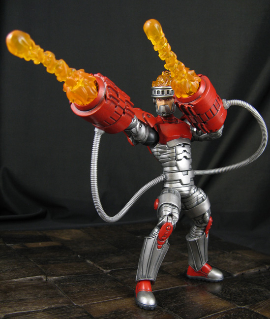 My Megaman Marvel Legends line returns with the appearance of a toasty nemesis, the Robot Masters Fire Man! This 6" scale custom Fire Man figure was created using the Ultron/Titanium Man body, lower arms and legs from a DC Direct orange lantern Lex Luthor, Transformers energon Scorponok turbines, and DC Direct Firestorm head with Aves Apoxie sculpted detail. Cyborg shoulder pads were added along with some flame effects so he could blast away at Megaman during battle.
