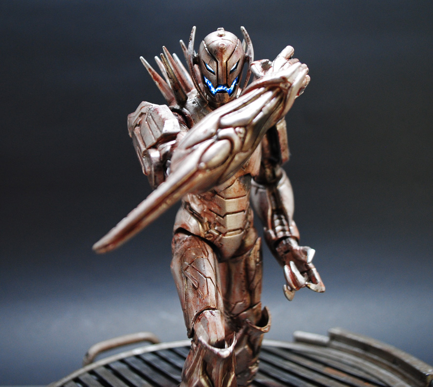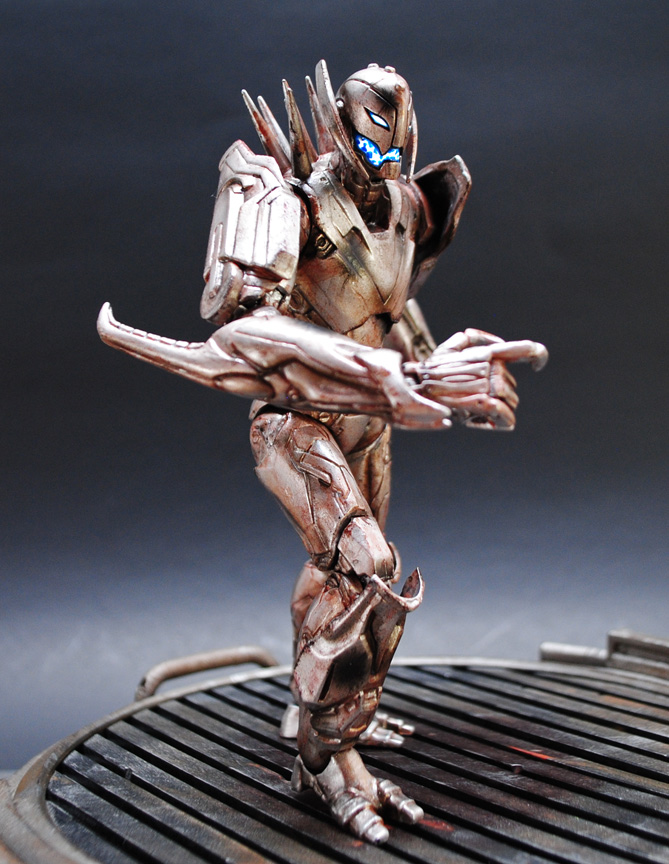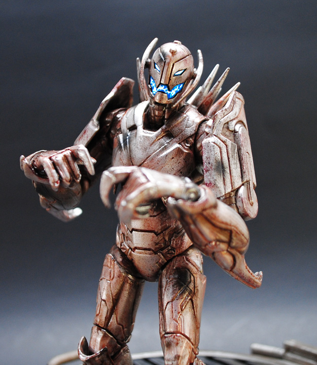 It's everyone's favorite homicidal robot Ultron and he's back for more punishment! Ultron never really goes away, he just upgrades himself and comes back stronger. Here I've created a battle-damaged Ultron using a Civil War Iron Man body, 3-pack Ultron head, old Toybiz Ultron lower arms, Beetle feet, and armor sections from magna-toys. Spikes were added to his back and all sorts of weathering, grime, oil splatter, and blast effects were applied to finish Ultron's look.