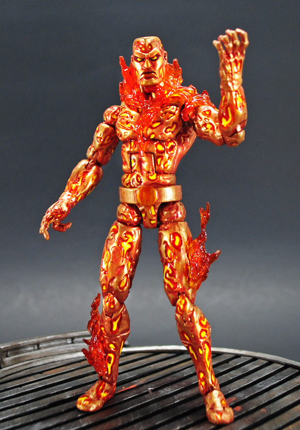 This week I'm bringing you another one of Spider-Man's rogue's gallery, the fiery foe Molten Man! He was created using a Toybiz Carnage base body, resculpted lower limbs with fodder hands, Sunfire belt, and old DCU Major Force head. Four-horsemen Scarabus flames were added as well as a movie Human Torch fire effect. A special mix of bronze, gold, and copper metallics were used and bright yellows/clear orange for his molten core effects were painted in. The end result was a striking look to one of Spider-Man's classic foes!