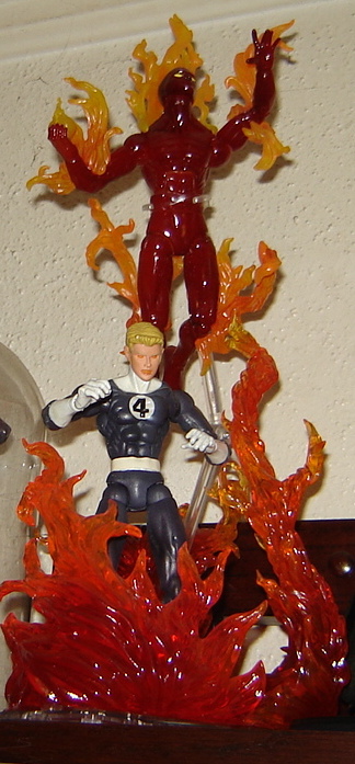 I like the fiery bits. Reminds me of my custom Human Torch figure. To me, as a kid, what made the Torch so cool was that he could fly! (This was before everyone in the Marvel Universe seemed to be able to fly. The same goes for Iron Man back then. These days who DOESN'T has an armored, flying suit?) But none of the Torch figures I've ever seen seemed to be designed to be posed in flight. I wound up with an extra (clear) Iceman from the last boxset. He was the right scale & fit the bill for the base figure. Painted him red with some clear automotive spray paint. Painted fiery bits with clear yellow. Stuck him on flying stand. Lost some POAs, but he looks more like Kirby's Torch to me...even better than that new Walgreen's effort. Looks like the best Silver Age FF set yet...which isn't saying that much, IMO. (BTW, I'm still waiting to see how the Thing from that set winds up looking...?) |
