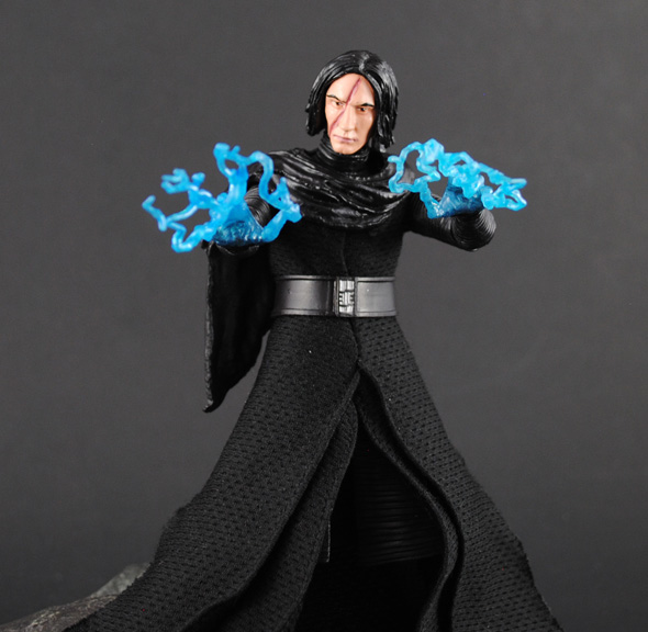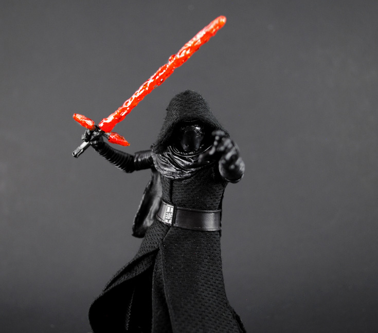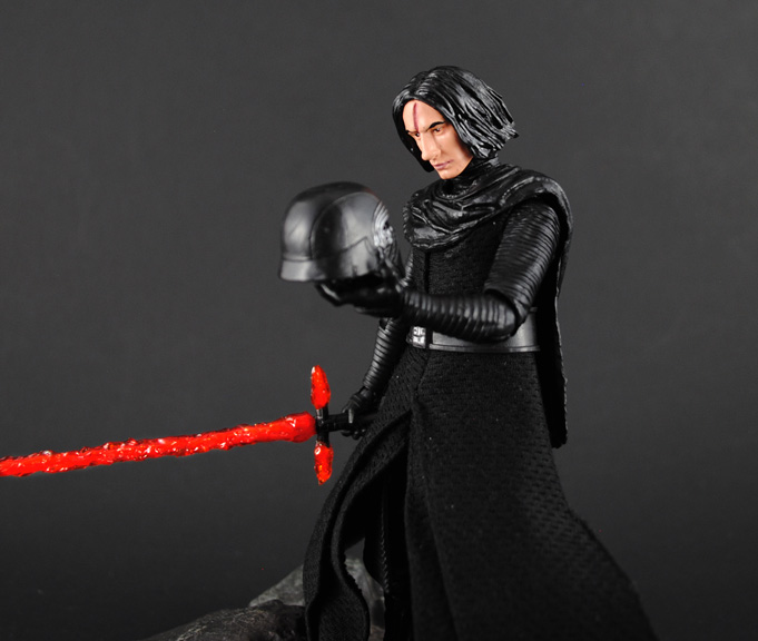 Star Wars the Force Awakens gave us a brand new villain, Kylo Ren of the First Order. However the 6" Black Series figure needed some upgrades. Here I've made the hood removable by undoing the stitching and wrapping the hood material around a modded Dr Doom hood that clips under the base of Kylo's helmet allowing it to turn with his head while laying flat. He now comes with open gesture hands modded from a Superior Venom, force lighting hands from a movie Elctro, and new unmasked head as shown at the end of the movie using a Prince Caspian character's head with newly sculpted features. Kylo's lightsaber was given the clear crackling flame look by sculpting clear epoxy around the blade and coating it with clear red/orange highlights.
