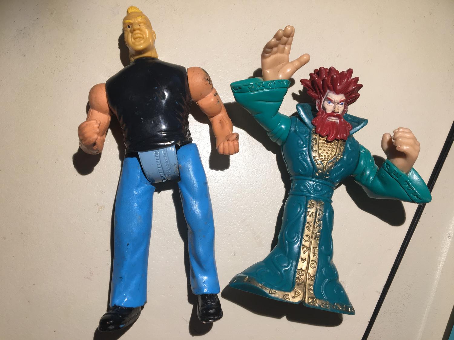 ![]() Both of these guys are unmarked. The Mohawk dude is 11cm tall and has movable hips, head and one movable arm. The wizard guy is 9cm and has 2 movable arms. Thanks all