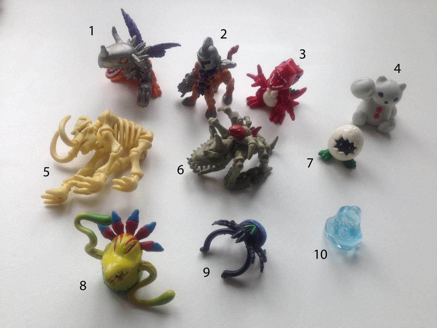 1 metalgreymon 2 centarumon 3 tyrannomon 4 frigimon 6 skullgreymon 7 digitamamon 8 vegiemon [There is a skull-mammothmon but it doesn't look like 5] |