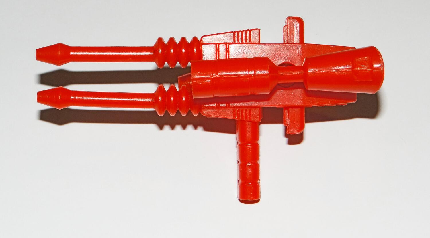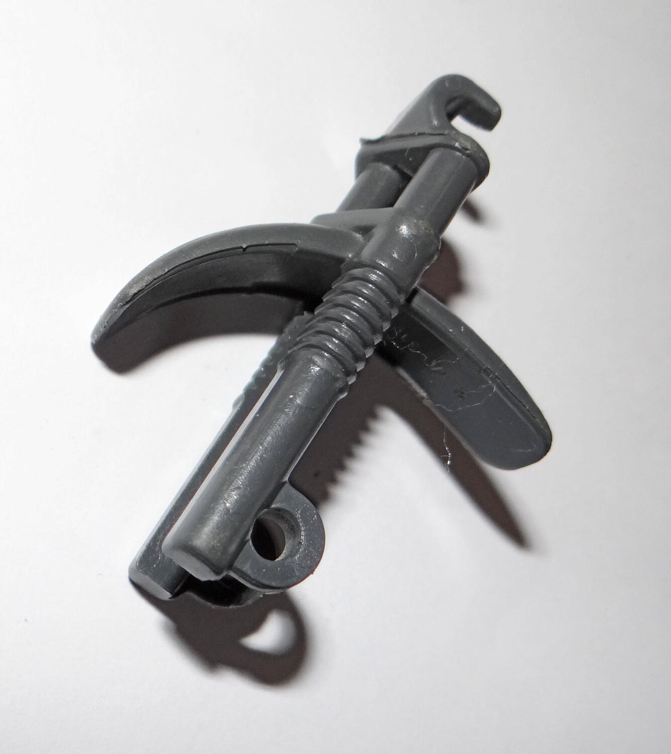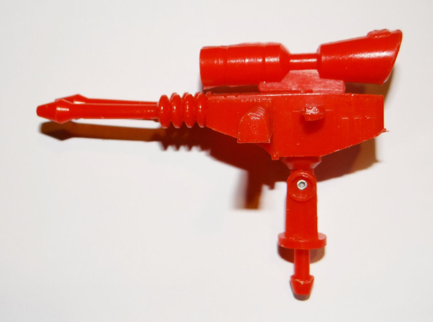 1. 2" wide double ended black hose? Multiple connectors, maybe GI Joe? 2. 1.5" tall motorcycle front forks. Thought it came with a GI Joe mini vehicle but it's not GI Joe. 3. 1" Tall red oil drum. Thought it was A-Team but it's not. 4. 3.5" wide orange/red double barrelled cannon. Has a scope and metal pin that enables it to move up and down. It's larger scale like a Mantech figure. Don't think it's Mantech though. Attached top and side photos for this part. Any help is greatly appreciated! Jeff |