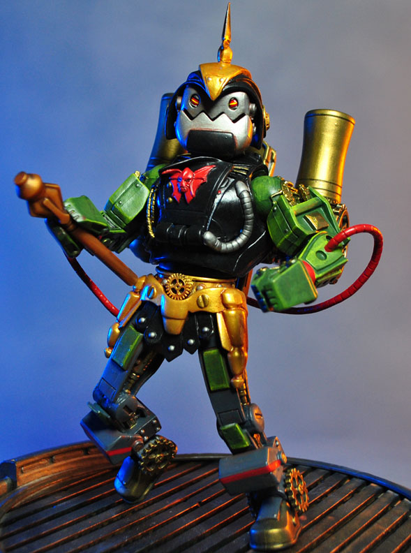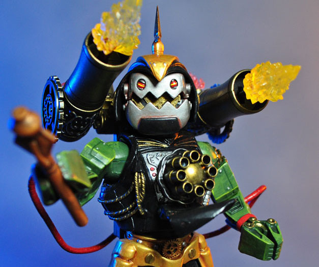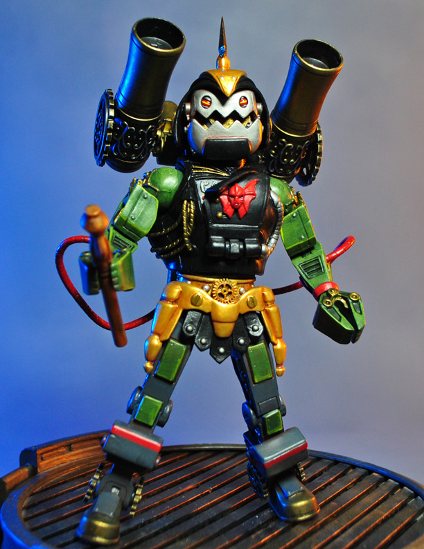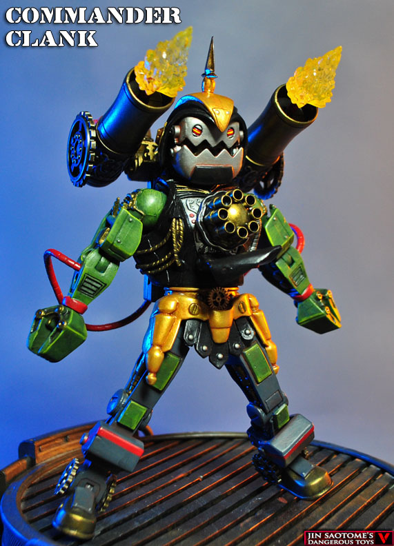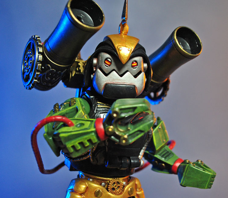 Another one of my original character creations, Commander Clank explodes into your Masters of the Universe collection with twin cannons blasting! He was created from a Twistoid upper body, multi-bot lower half, Horde Trooper feet, a Skylanders head, and Rio-Blast armor/backpack. I modded the jaw to move and fashioned two large cannons that I think came from a Pirates of the Caribbean At World's End toy to the sliding posts. A magnetic chest-mounted Gatling gun attachment finishes the look of this battlefield bot along with a lot of metallic paint effects and weathering. |