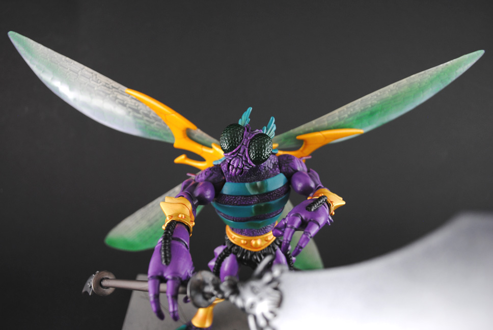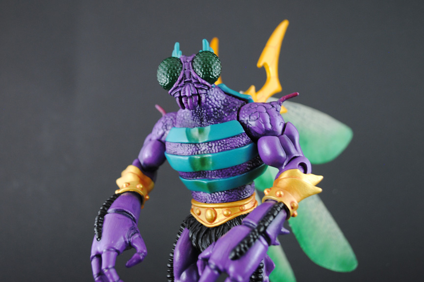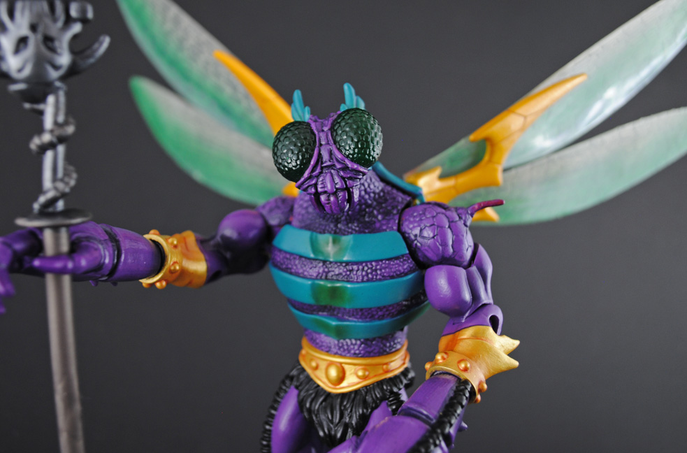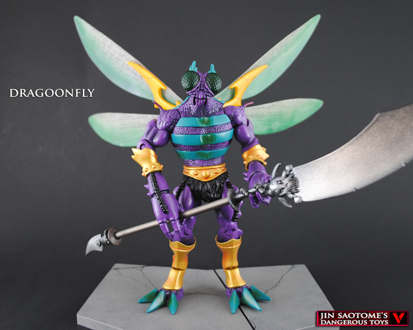 "The skies have never been friendly in Eternia as all sorts of creatures and machines take to the air to do battle. Joining the fray is the Dragoonfly warrior, ally of Buzz-Off and guardian of the Eternian marshland. Equipped with a powerful halberd this insectioid warrior can speed overhead without a sound and find his mark with deadly precision."