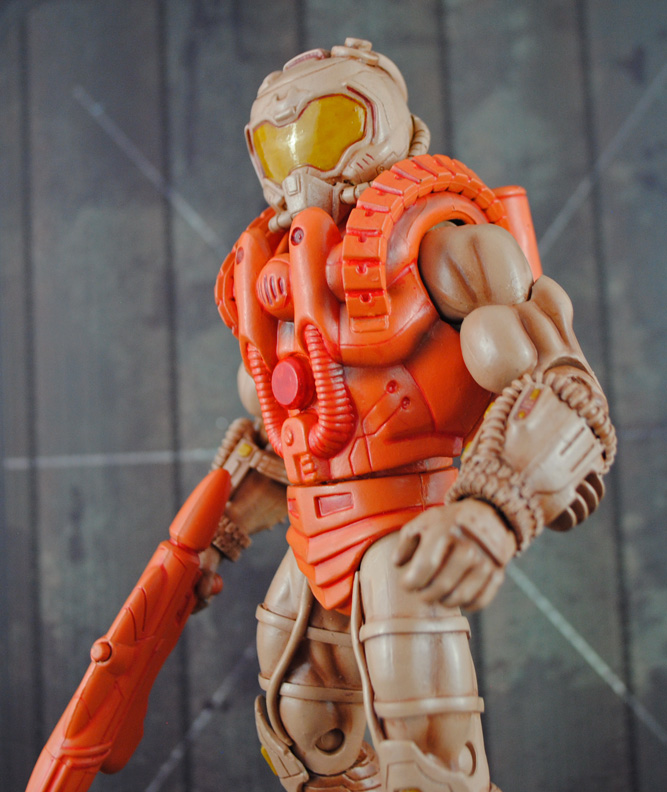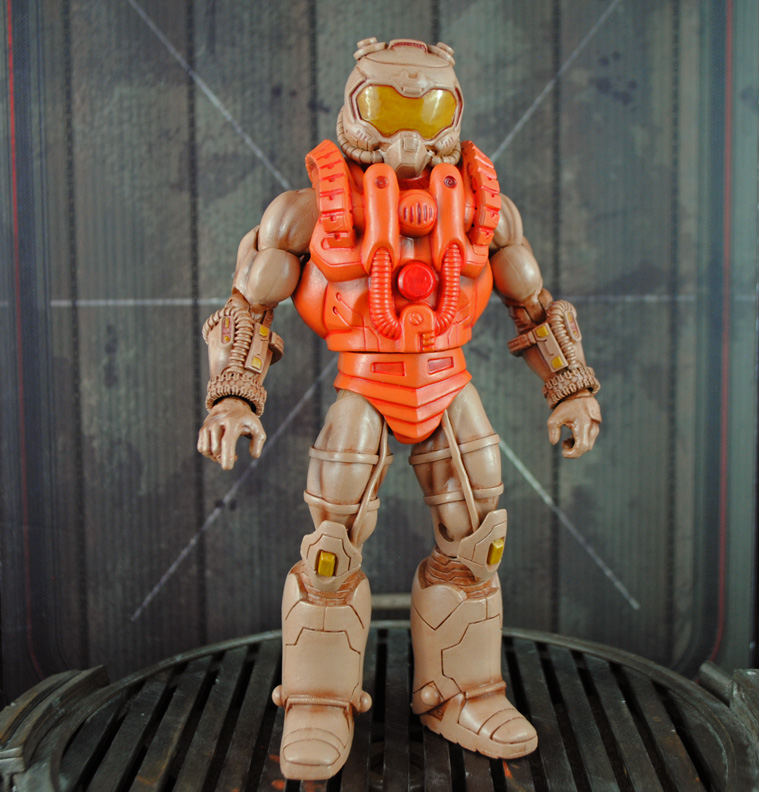 This character is based off the vintage line of Air Raiders toys! Originally a diminutive 2-inch tall heroic Air Raiders figure I've recreated him in 7" MotUC scale. The Air Raider was created using a Hydron body and chest piece, Eternian guard waist armor, Evolve Markos modded arms, DC Cyborg lower legs, and a modded Funko Mini Doom soldier head. Air Raider was painted close enough to the vintage figure's two color scheme but with enough extra detail to make it match the MOTUC figure line.