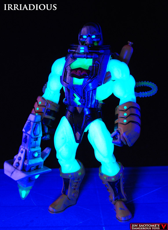"Many have ventured into Hordak's lair in an attempt to defeat the evil ruler but none have ever been successful. Most have suffered terrible fates, one such forgotton hero was captured and experimented on. Bombarded with the radioactive rays from the same machinery that helped create Dragstor, Irradious was born! This atomic powered evildoer can generate searing beams of destruction from his eyes or focus powerful blasts through his weapon. Watch out He-Man, Irradious is ready to charge into battle and burn down any who stand in his way!"
