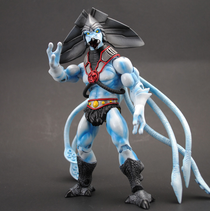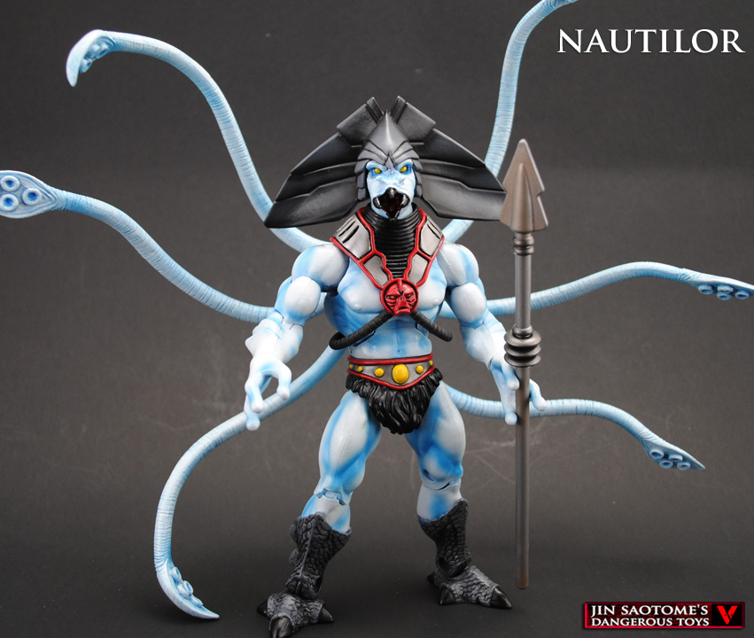"The Eternian Oceans have always been dangerous areas to explore but now they've turned deadly with the dreaded Nautilor sailing them. After being transformed by Hordak's magic into a powerful soldier of the sea he took up piracy and raided any ship that crossed his path. Once a being is wrapped up in Nautilor's tentacles their life force can be drained and their strength added to his for a short while making him a force to be reckoned with. Nautilor now searches the Eternian Oceans for Ty-Daal-Ray in hopes of getting his revenge for their last battle that left his vessel crippled and adrift for days, adding insult to his injury."