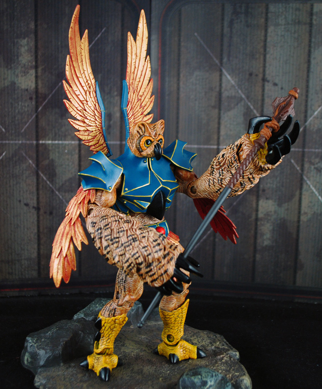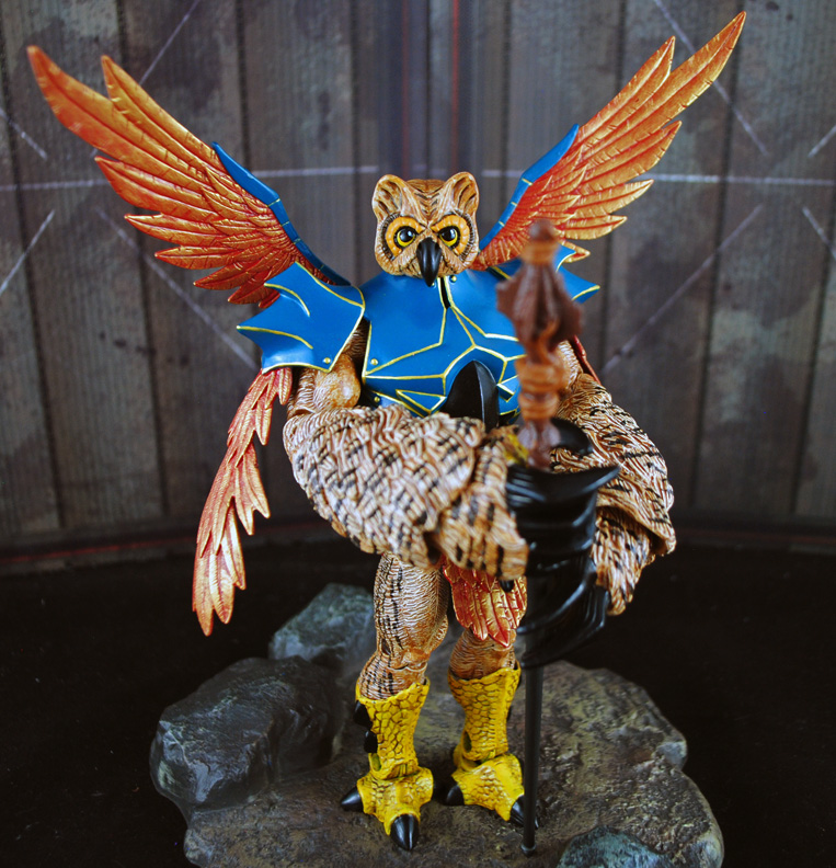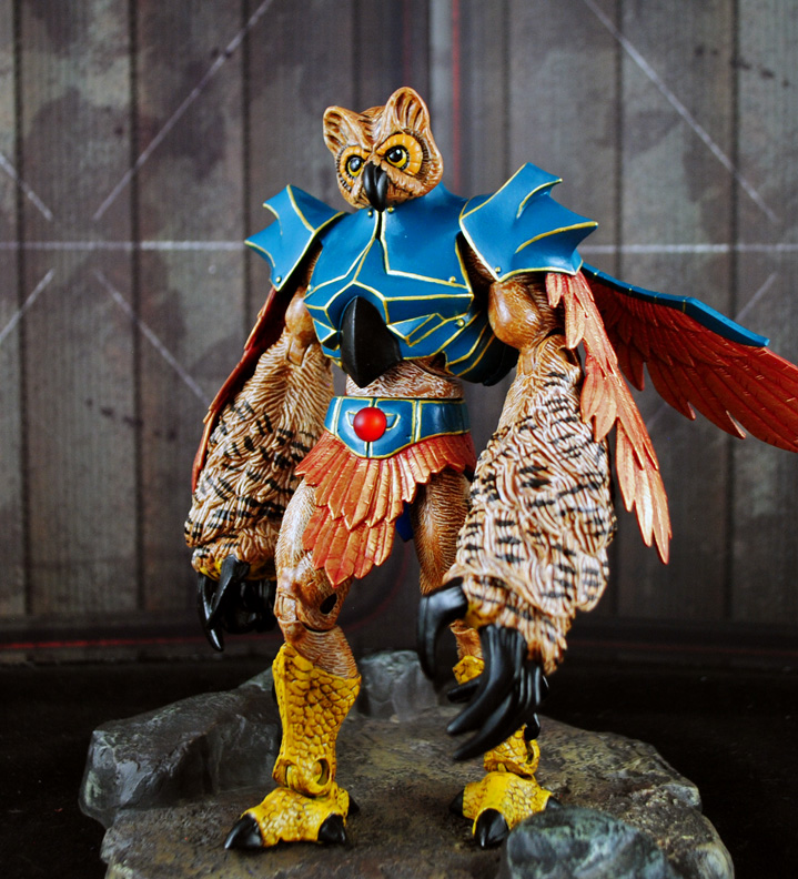 "The heroic warrior Nocturnous is master of wisdom who is always ready to aid He-Man on his quest for knowledge. Guardian of the Sacred Egg, Nocturnous holds the secrets from generations of skilled brethren who served as Guardian before him. With keen eyesight and powerful talons that can shred through the strongest armor Skeletor will have a difficult time stealing any secrets from this avian warrior!"