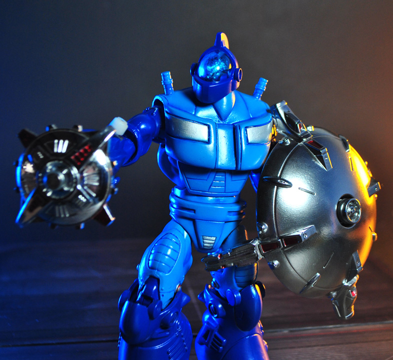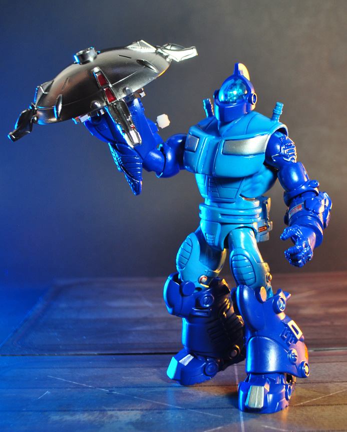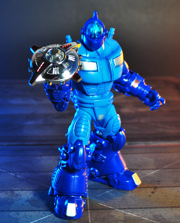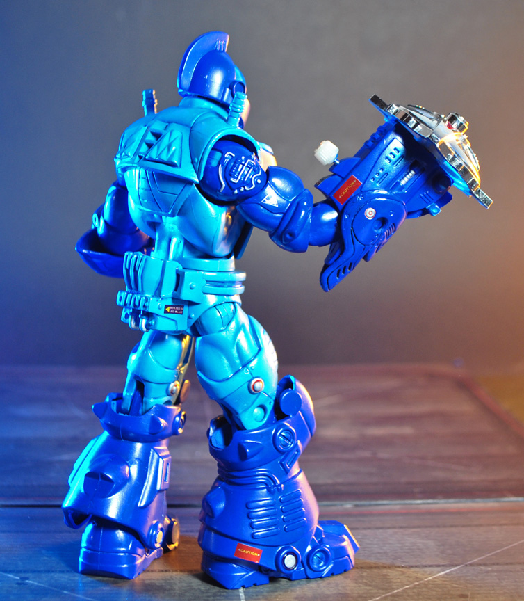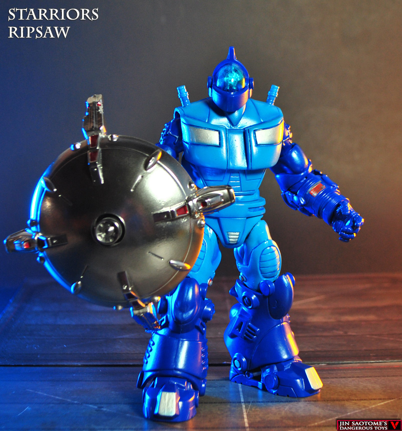 Another toy line of the 80's, the Starriors arrive! This week we have a re-imagined version of the Protector class Ripsaw, created in MotUC scale. Using the original head and weapon arm of the figure I took a Rotar body, Extendar limbs, MARS robot lower legs, Captain America Mecha feet, and a Zoid-crab shell for the metallized shield. The shield is magnetic and attached to Ripsaw's original spinning blade-shield arm which was grafted on. Spaz-Stix mirror Chrome airbrush paint was used on the larger shield. Different foil warning/caution stickers were applied like the vintage toy featured and Ripsaw was given metallic blue airbrushed highlights. |