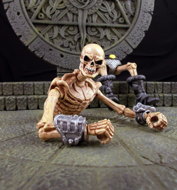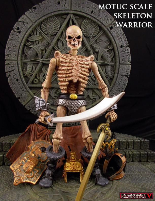 When the reanimated skeletons of warriors fallen in battle arrive at your doorstep you some sort of dark magic has to be at work. Enter everyone's favorite bone-baddie the Skeleton Warrior! Credit to He-Mike Customs for coming up with the vintage Aracula recipe for this figure. I used a MOTUC King Hsss waist so you can pop the Skeleton Warror apart to make it look as if he's coming out of the ground or crawling. Vintage Skeleton Warrior Aracula bones and torso were used and a Castle Grayskull skull was modded for the head. Now it was time to accessorize him with all sorts of armor, helmets, weapons, and cloaks. You can mix and match parts to get an Egyptian, gladiator, or Rogue look. A multi-jointed neck vertebra allows him to get those creepy hunched poses. Watch out He-Man, the undead approach!