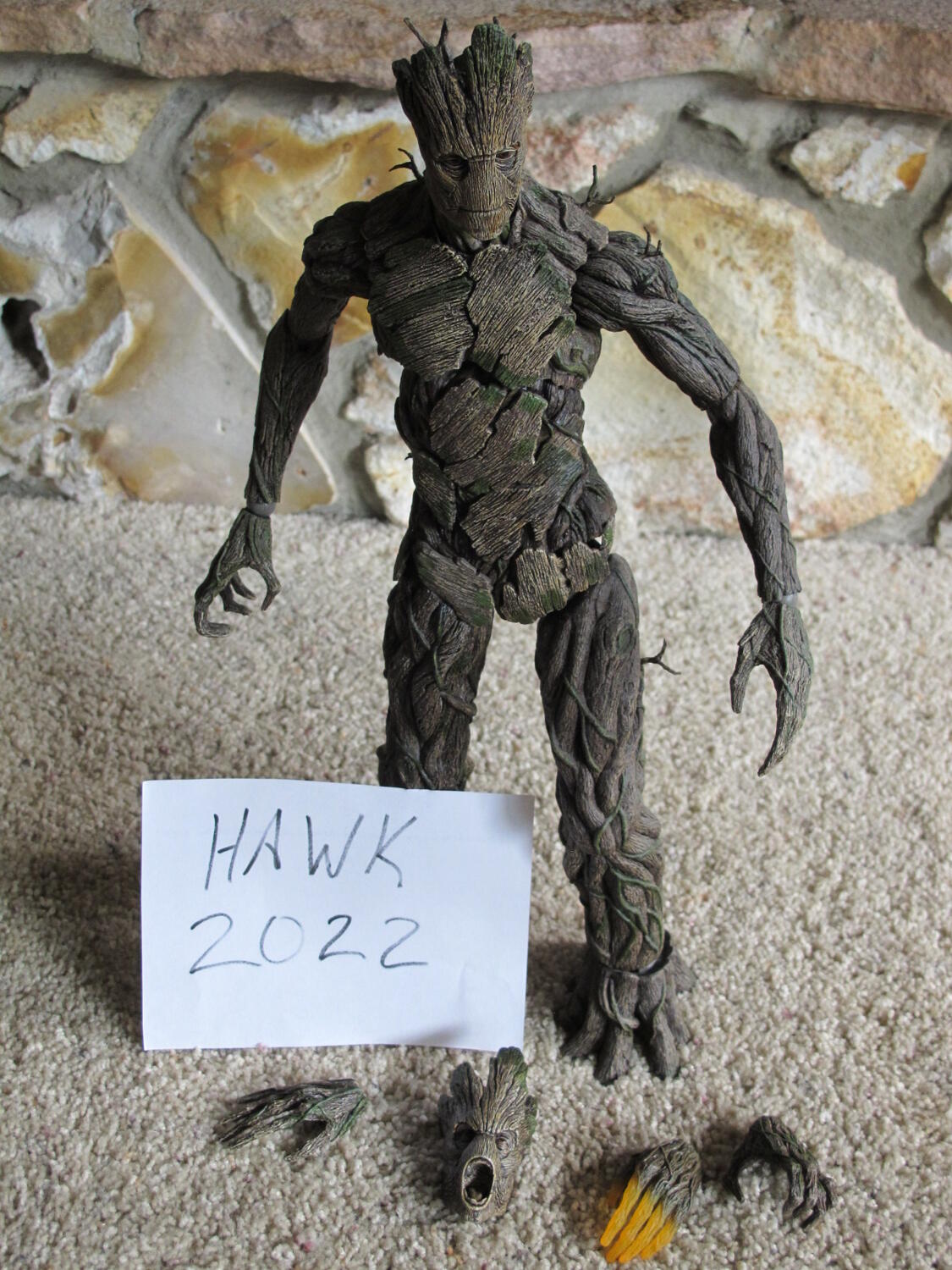 Star Lord with the short jacket has a little rub in the front of jacket, But you don't see it if the armor is on. Starlord comes with what you see. Not complete. Groot is a 3rd party figurer, but REALLY well done IMO.
