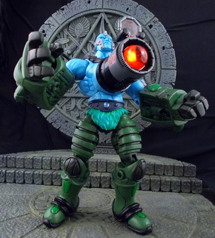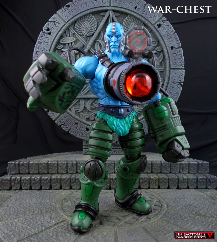 In the cosmic arena controlled by the space faring Game Master the combatants fight for glory but rarely freedom. War-Chest was one of the many fighters that longed for his home planet but knew he would never be accepted back with the bio-mechanical additions that Game Master had grafted on to him. Wielding the power to blast powerful rays of energy from the cannon upon his chest, War-Chest was at the top of his ranking before Vykron defeated him. War-Chest won his freedom when He-Man defeated Game Master and escaped to Eternia to start anew.
