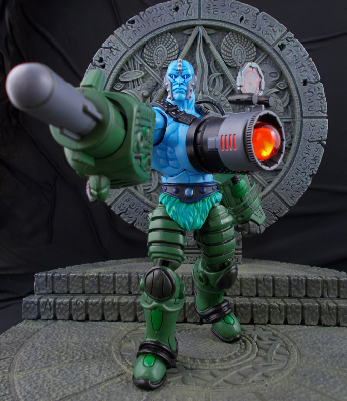 This concept character for Game Master's cosmic arena games was created using a Sy-Klone upper body, Flogg waist/upper legs, unknown figure's lower legs, Cy-Chop modded head, and Overtkill lower arms. A Captain America WS binocular set piece was used for the cannon and a Sigma 6 missile weapon for the removable hand. |