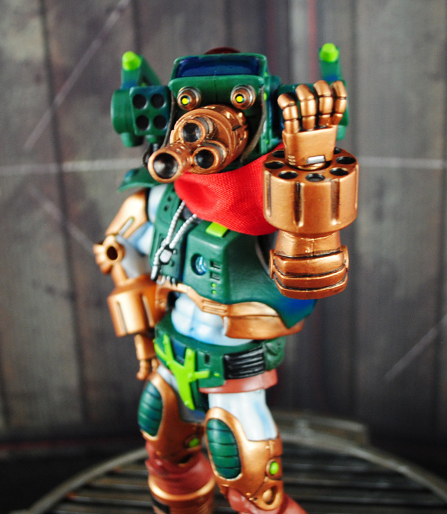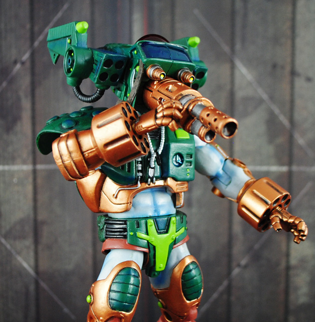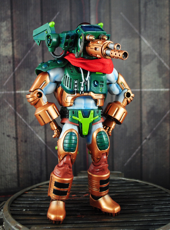 Need a pilot for your Masters of the Universe vehicles? Then I give you War-Head, the know-it-all maverick of battle machines! War-Head was created using a Karatti body, heavily modded Photog head flipped upside down, hands from a Digimon Megagargomon, Galactic He-Man vest, and Dark Knight Returns lower legs.