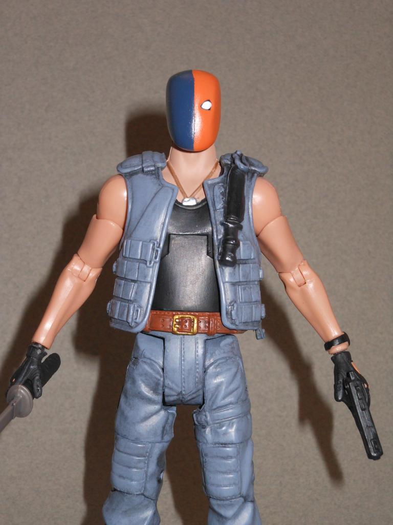 heres a deathstroke figure that i made to fit in with the batman movie master figures. i started with an avatar movie master figure, i repainted the clothes and sculpted the helmet. it turned out pretty good i think..i like that the base figure just happend to have dog tags