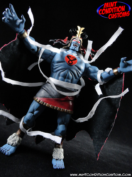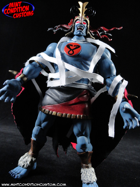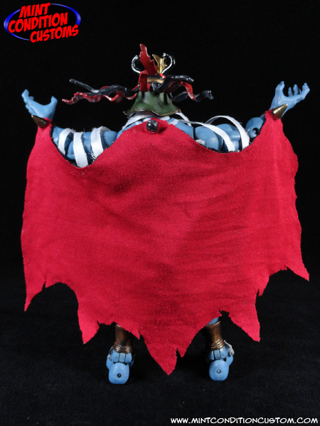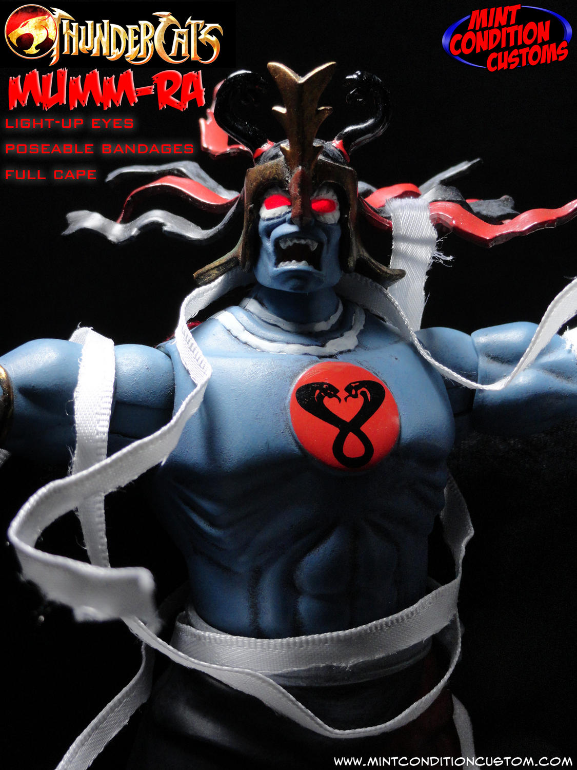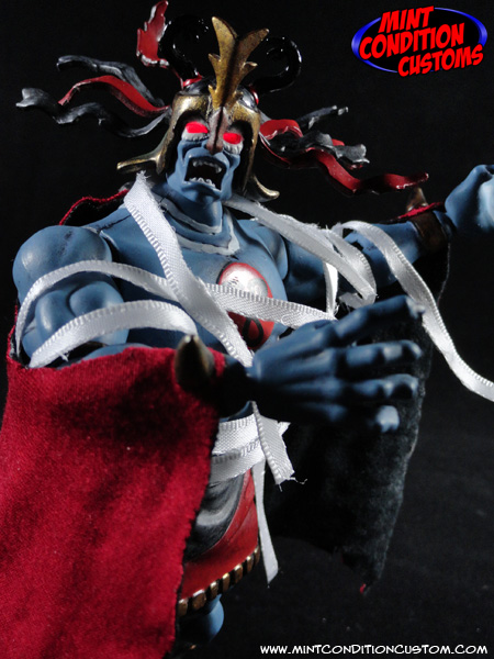 Ever since I first saw the Thundercats Classics Mumm-Ra action figure, I saw a lot of potential. The big hollow torso meant I could fit some wiring in there, and that was what made me give him light up eyes! I made sure it wouldn’t interfere with the head movement, so the head still retains full articulation and stays lit up the whole time with a flip of a switch on the back. I also took some poseable ribbon and made him some bandages that can be wrapped around the figure any way you like, and even posed to look like they’re shooting out, as if Mumm-Ra is about to grab one of the Thundercats to mummify! And of course I had to give Mumm-Ra his awesome cape. I took some red and black fabric and combined them to be show accurate, and made the cape look tattered and worn. It looks cool, is easily attachable and detachable from the figure, and moves perfectly in conjuction with the arms of the figure. After a full repaint to make him look more realistic, such as making his gold armor look ancient and rusted, Mumm-Ra is ready to summon the ANCIENT SPIRITS OF EVIL to take down those pesky Thundercats!