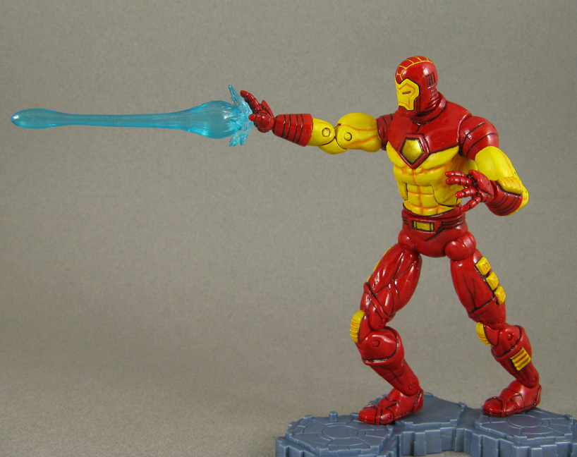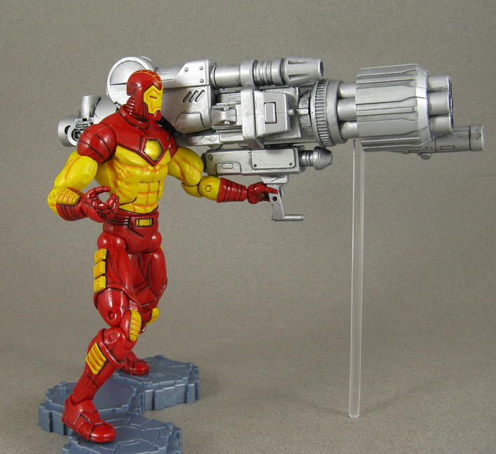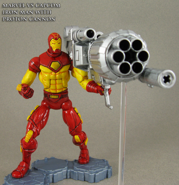 PROTON CANNON! When you hear that ingame it usually means 50+ hits and the loss of one of your characters. Well here I've brought Iron Man right off the ingame screen of Marvel vs Capcom2. The base is the Face Off Iron man with a modified neck so he can look straight up, two pairs of hands from the Mark V Legends, and Gundam beam blast modded into a repulsor blast. The Proton Cannon was made from a Sigma 6 Cobra Commander bazooka with all sorts of parts fodder from different weapons added with some sculpting to finish off the look. Now Iron Man can blast the bad guys into particles while wearing his Sunday best!