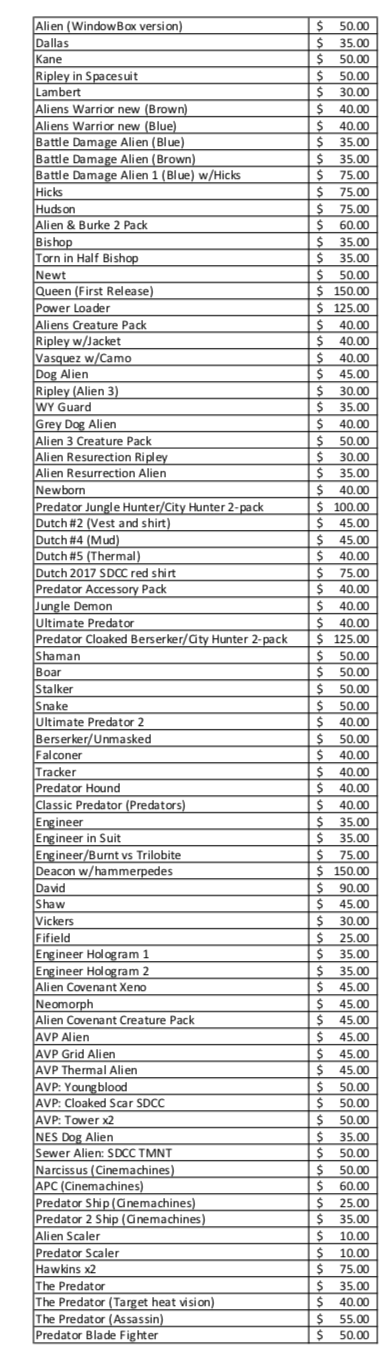 I have a list here of the remaining NECA Alien and Predator figures I have for sale. DM me for pictures of whichever ones you are interested in. All are still in the package. Shipping not included. |