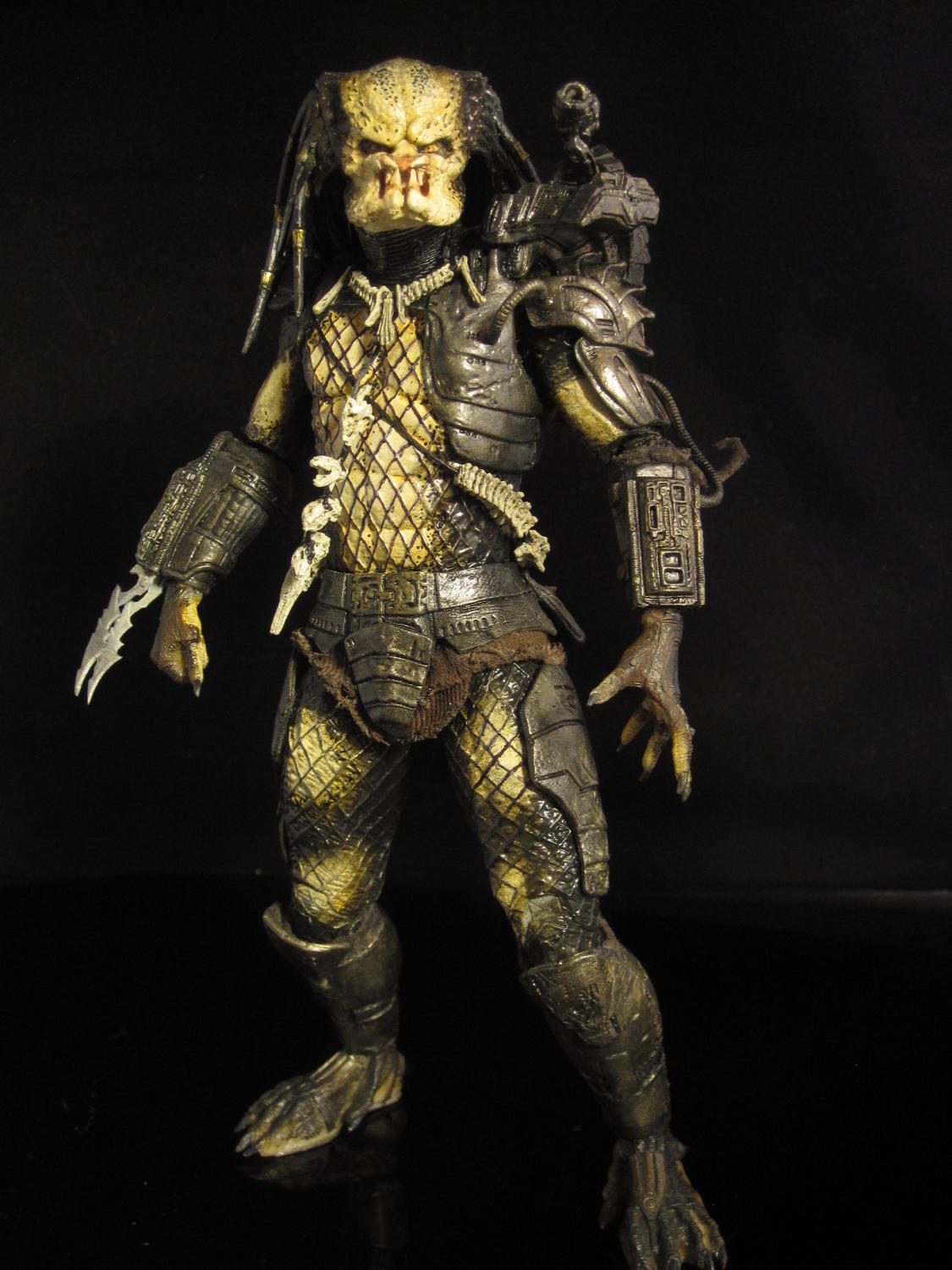 hey everyone, this is one of my favorites. this classic style predator was made from the head of the "snake" predator, body of the "city hunter" predator, cast mask and the fore arms and armor of the classic predator. mash it all together and add some paint and voila. one not too shabby predator.