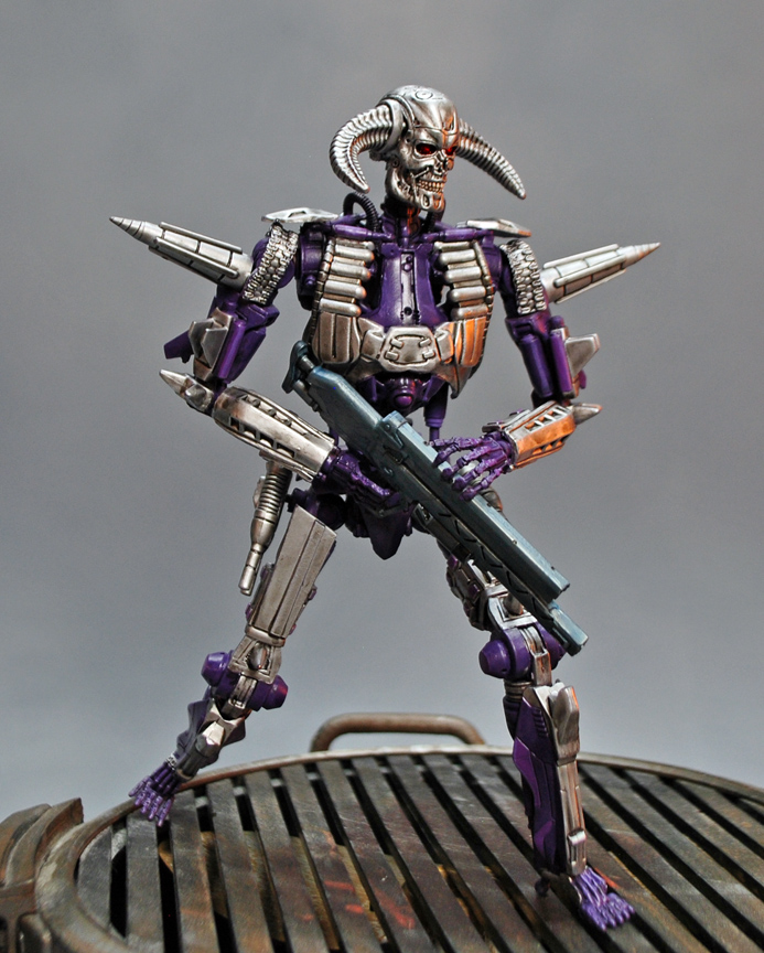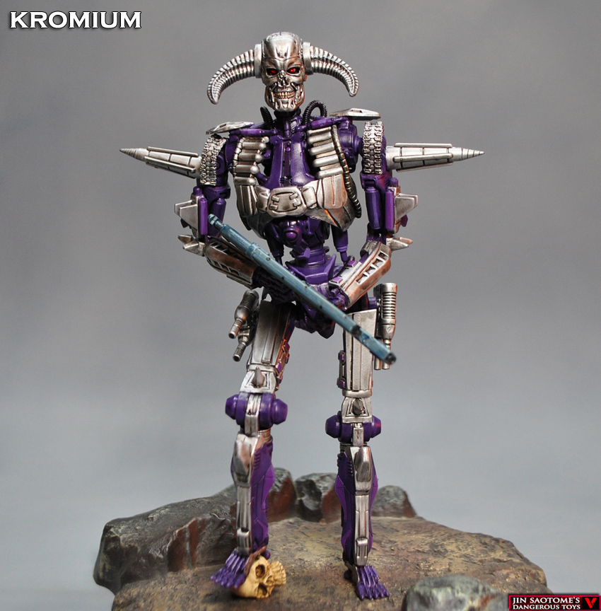 Kromium was made using a classic NECA Endoskeleton, BAF Odin horns, Cylon/Iron Man/Star Wars/Halo/Gundam/Transformers and scratch built sections to complete his armored-up look. I used Testors Aztek Airbrush paints (brushed on) and he was entirely shaded using The Army Painter's Quickshade wash sets and sealed using Mr Hobby Mr Top Coat semigloss Premium sealer. |