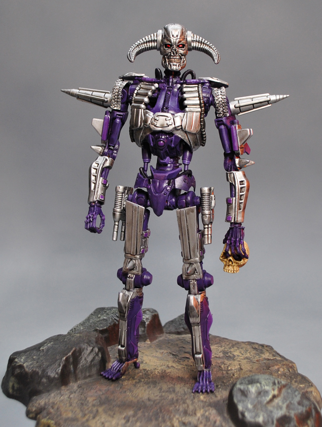 When an army of unstoppable shiny silver T800 Endoskeletons can't defeat the human resistance there's only one thing for Skynet to do....create a purple one with horns and hip-blasters! Ah yes the golden years of Kenner Toys gave us some amazing designs, some a bit more interesting than others such as the endoskeleton Kromium from their vintage Terminator Future War line. While I wasn't able to incorporate the extending feature the vintage toy had (there's not much plastic to work with using a plain Endo) I tried to get him as close as I could to the original design!