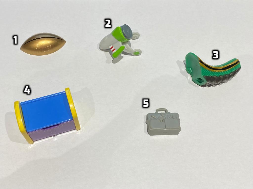 Number 2 is Toy Story Buzz Lightyear I should think, but not sure which figure. Number 3 I think might be a power ranger figure? Number 4 I am not sure, can't even find the brand logo (two angels) Number 5 is a tool bag but I don't know what for - the front holds keys and a stick of dynamite but I have searched for it and can't find any information Any help is appreciated as I have spent ages looking for these! |