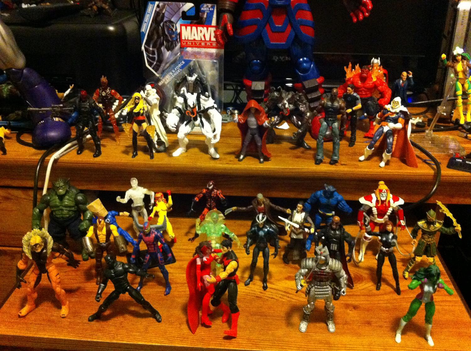 What an awesome contest raf! Here's my story: did not collect since I was a kid. Walked into a fred meyer, saw this toyline and fell in love with it. passed on solid vision in favor of a friggin silver surfer! Thought I could come back and get him, haven't seen him since. Been meaning to make a custom but don't have the skills yet. I've lost a ton of bids on solid vision. These figs are some of my favorites that I spent a lot of time or money to get, some are obviously poor customs, but they have staved off me wanting to buy the real thing. I picked up a phasing loose vision last summer on eBay, and that ghostly fig represents a hole in my collection that has been an absolute bitch to fill. It's only appropriate that the phasing vision sits in the middle of that pic taunting me as he is unable to materialize thus far. Vision would be the one that would make my collection feel complete (I'm not a completionist so I don't have some). As far as my economic situation goes I have a well paying job (PM me if you want my salary lol) have a wife, kids and other financial obligations so I always feel too guilty to spend the market price that vision commands. But yeah phasing vision sits in the middle of the pic and represents the missing link in my MU collection. It's fitting that he shakes his fist unable to solidify while his wife skanks out on him with wonderman of all people! Why!?! A male Wonder Woman rip off! My phasing vision sits in a bar at night by himself drinking a sorrow cocktail through a straw saying "I've been cuckolded by Simon Williamson (and Clint Barton)!" A solid vision would mean that he could be reunited with wanda maximoff, because deep down, she is still in love with vision. After all she's done, he is still willing to take her back. Why? Because she is his one, crazy, stupid, true love.