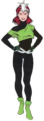 The female figure is totally an 80's Rogue in her black costume with the green boots, white crisscross belts and crazy hair.