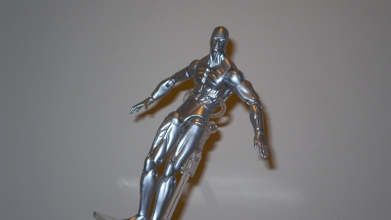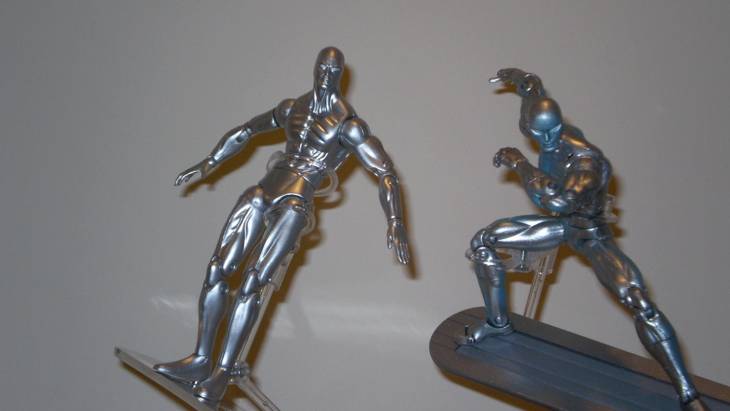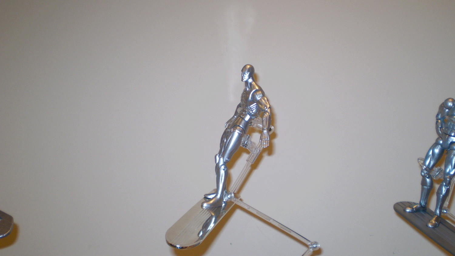 You are more than welcome. I'm glad to have done this as my opinion of Hasbro's Ronan Series Silver Surfer has improved slightly. I still prefer the Toy Biz sculpt, but my criticisms of the Hasbro fig are not as strident. Hasbro Surfer: Pros (opinion) Face - it looks more like what one would expect Surfer to look like given depictions in Annihilation and Annihilators Hands - more utilitarian; could be blasting power cosmic or indicative of maintaining balance in a typical surfing posture Board - Gleaming and reflective Hasbro Surfer: Cons (opinion) Head - pea-sized noggin is out of proportion with body Sculpt - shoulders are narrow giving fig an almost teen-like appearance; trapezius muscles are over pronounced creating strange look Board - very thin offering only one foot peg limiting where Surfer can be placed Toy Biz Surfer: Pros (opinion) Face - features large eyes; the look given to the character by Jack Kirby (intended to make him "obviously" alien looking) Sculpt - many points of articulation creating a wide range of poses Board/Feet - magnets in feet allow Surfer to placed at multiple points on board (portion of the board is a metal strip) Paint - silver paint is accented with blue highlights (pics don't really demonstrate this); paint has metallic flecks (can be seen on some pics - my camera and camera-skills are both lacking Ha!) Toy Biz Surfer: Cons (opinion) Face - some may not like Surfer's bug-eyes Sculpt - shoulders look a little wonky when arms are resting at sides due to additional shoulder hinge articulation Hands - hand with index finger extended is silly looking Board - clunky looking when held at Surfer's side |